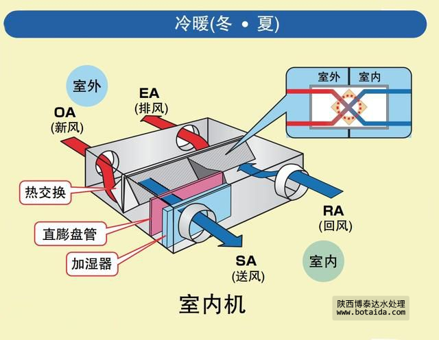 主要部分就是全熱交換機(機內(nèi)有過濾裝置),作用就是將室外空氣吸入經(jīng)過過濾和要排出的空氣進行熱量交換,使得新風口出來的空氣與室內(nèi)溫度溫差不大,從而達到舒適度和能耗上良好的效果。