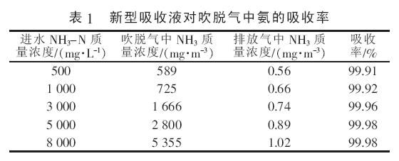 由表1 可知, 新型吸收液可高效去除不同氨氮濃度廢水吹脫氣中的氨,去除率達99.9%以上,吸收后排放氣中的氨質(zhì)量濃度最高為1 mg/m3 左右,全能滿足《惡臭污染物排放標(biāo)準》(GB 14554—1993)中氨排放標(biāo)準。