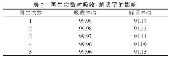 由表2 可知,吸收液經(jīng)5 次吸收-解吸循環(huán),對氨吸收率均保持在99.9%以上, 解吸率均達91%以上,表明新型吸收液具有良好的可再生性。