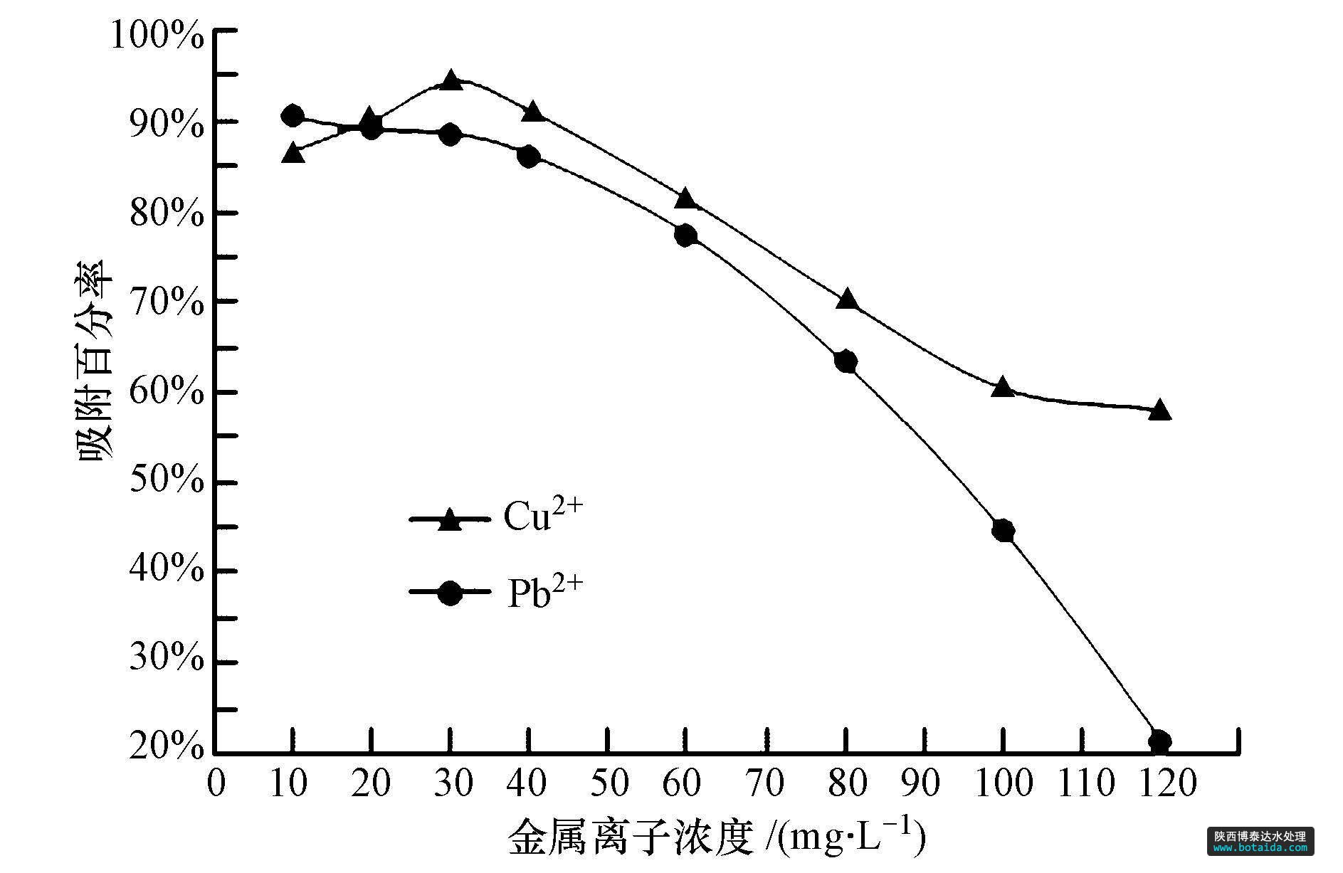 圖9 不同初始濃度對(duì)Cu2+和Pb2+吸附百分率的影響