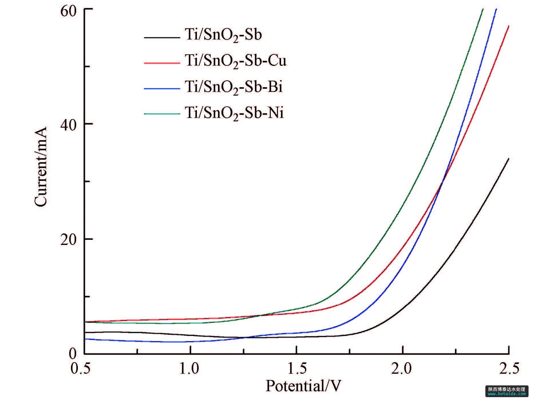 電極的析氧電位是影響有機物電化學(xué)降解效率的重要因素,有機物在陽極發(fā)生氧化的同時,伴隨著析氧副反應(yīng).析氧反應(yīng)的發(fā)生主要是因為電極表面吸附的· OH和轉(zhuǎn)移到晶格內(nèi)的O不穩(wěn)定,除了可與有機物發(fā)生反應(yīng)外,還可能以O(shè)2的形式釋放(李善評等,2008).當(dāng)析氧電位低時,通過的電流大部分用于氧氣的析出,導(dǎo)致有機物降解效率降低;當(dāng)析氧電位高時,氧氣難于析出,有機物在陽極直接被氧化降解的概率就會增加.因此,較高的析氧電位是催化電極的一個重要指標(biāo).