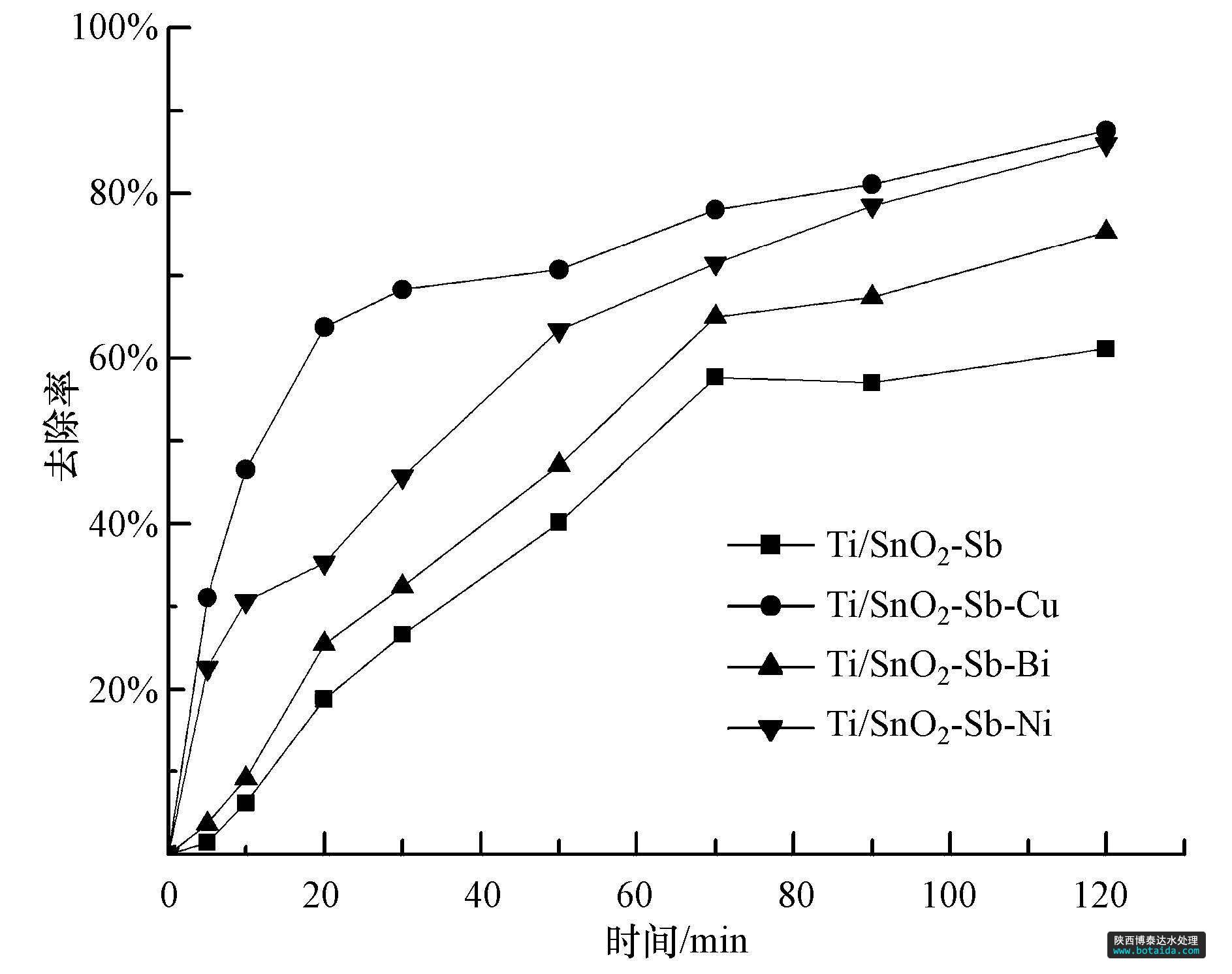 在自制電解槽中,以1,4-二氯苯為目標(biāo)降解物,加入濃度為100 mg · L-1的廢水,同時添加3.55 g的Na2SO4作為支持電解質(zhì),以摻雜不同金屬的Ti/SnO2-Sb電極作陽極,石墨作陰極,通過磁力攪拌裝置控制一定的攪拌速率,恒定電壓為15 V,板間距1 cm,分別測定不同時間1,4-二氯苯的降解情況.1,4-二氯苯的測定采用高效液相色譜法.