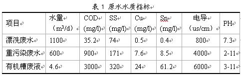 某電子公司是國內(nèi)重點集成電路封裝測試企業(yè),該公司主要從事半導體集成電路、半導體元器件的封裝測試業(yè)務,其生產(chǎn)線廢水主要包括兩部分,一部分為晶元的減薄劃片廢水、另一部分為電鍍錫化廢水。減薄劃片廢水中主要含有大量的硅粉微粒,SS約2000mg/L左右,特性很穩(wěn)定,不易沉降,電導率僅為2-4µs/cm,東洋采用自主研發(fā)的二級連續(xù)UF膜系統(tǒng)進行進行廢水回收利用,廢水回收利用率≥90%,回收水質(zhì)好,同時回收硅粉。在此主要介紹電鍍錫化廢水的回用處理系統(tǒng);廢水中主要含有Cu、Sn、酸堿、有機物等,在該項目中首先要做好分質(zhì)分流是尤為重要,把錫化電鍍線上的廢水按照水中的成份及濃度來分質(zhì)收集,主要分為漂洗廢水、重污染廢水、有機槽廢液三路,水質(zhì)如下: