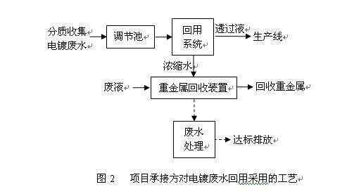 經(jīng)過多年電鍍廢水及涉重金屬的研究及工程實踐,摸索出一套成熟穩(wěn)定的電鍍廢水回用技術(shù)(連續(xù)錯流抗污染多級膜法回用),把電鍍廢水分質(zhì)收集,單獨膜法回用,回用水可分別用到對應的生產(chǎn)線或作為自來水使用;目前項目承接方采用的回用理念是“先回用后處理”,把廢水先進行分質(zhì)收集,單獨膜法回用,回收率≥85%,濃縮后的廢水中重金屬離子濃度可提升到100倍以上,對該濃縮廢水可通過重金屬回收裝置(專利號:CN201010578758.5)進行重金屬的提取,大大提高了重金屬的回收效率,回收重金屬的同時,也減輕后需廢水處理的負荷。