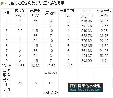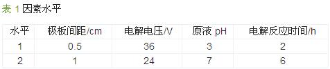 設(shè)計極板間距(A)、電解電壓(B)、原液pH(C)和電解反應(yīng)時間(D)4因素3水平L9 (34)正交實驗表,如表 1所示,實驗結(jié)果列于表 2。
