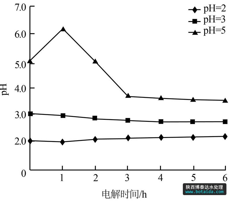 圖 3 初始pH為2、3、5時pH隨時間變化情況