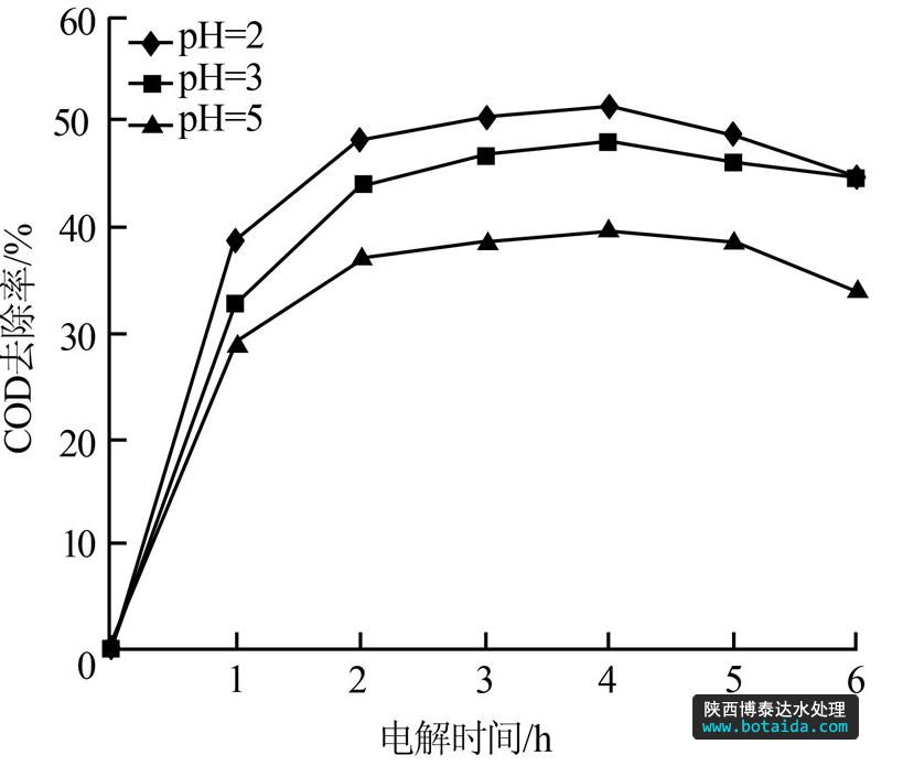 調(diào)節(jié)pH分別為2、3、5,固定電解電壓為24 V、極板間距為1.0 cm,每隔1 h取1次水樣,測定電解后滲濾液的COD及pH,結(jié)果如圖 2和圖 3所示。