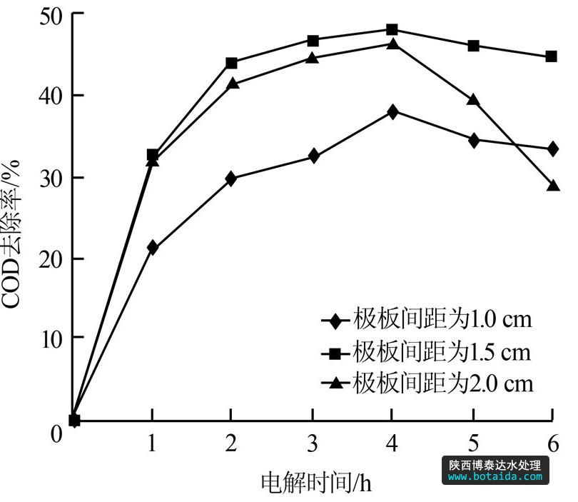 (3)調(diào)節(jié)極板間距至1.5~2.0 cm對提高垃圾滲濾液的COD去除率有利。過小的極板間距會產(chǎn)生短路現(xiàn)象,過大則會降低去除效果。
