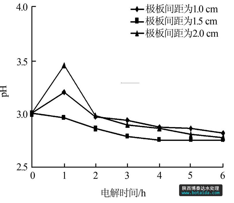 圖 6 不同極板間距下pH隨時間變化情況