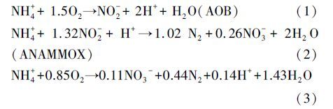 CANON(Completely Autotrophic Nitrogen Removal over Nitrite,CANON)工藝是一種新型的生物脫氮工藝,其脫氮原理為:氨氧化菌(Ammonia-Oxidizing Bacteria,AOB)利用溶解氧(Dissolved Oxygen,DO)將NH4+-N氧化成NO2--N,厭氧氨氧化菌(Anaerobic Ammonium Oxidation,ANAMMOX)利用AOB提供的基質和創(chuàng)造的缺氧環(huán)境對NH4+-N和NO2--N進行轉化從而實現(xiàn)脫氮.反應過程如下: