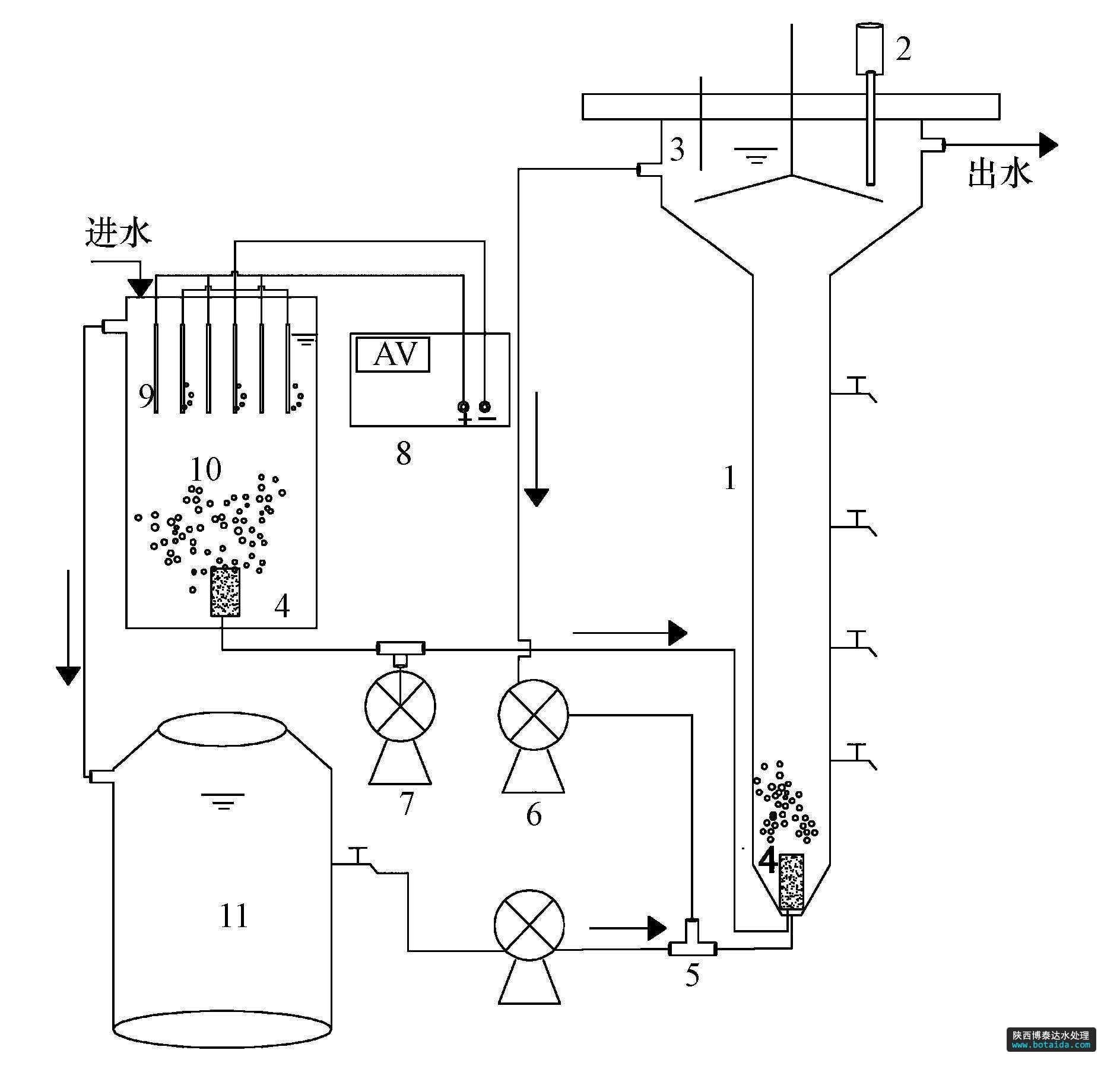 圖1 電絮凝-CANON工藝裝置示意圖(1.EGSB,2.溶解氧儀,3.溫度計,4.曝氣頭,5.三通,6.蠕動泵,7.空氣泵,8.電源,9.鋁板,10.電絮凝反應器,11.調節(jié)池)