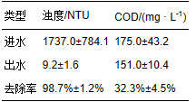 電絮凝工藝能夠降低廢水濁度,去除重金屬、酚和有機物等(Al-Shannag et al., 2014;2015),具有效率高、無二次污染(無需添加化學藥劑)、污泥產(chǎn)量低、設備簡單易模塊化等優(yōu)點(陳斌等,2012;Yousuf et al., 2001).利用電絮凝工藝對石油裂化催化劑廢水進行預處理,能在一定程度上保證CANON工藝進水水質,減緩重金屬和有機物對厭氧氨氧化菌的影響.在極板間距1.5 cm、電解時間 25 min、電流密度 25 mA · cm-2、pH 9.0的運行條件下,考察了電絮凝對石油裂化催化劑廢水的預處理效果.結果表明(表 4):電絮凝出水穩(wěn)定在10 NTU以下,濁度平均去除率為98.7%±1.2%,COD的平均去除率為32.3%±4.5%.分析認為,電絮凝產(chǎn)生的Al3+與陰極產(chǎn)生的OH-反應生成一系列的單核和多核羥基絡合物絮體,并通過吸附、網(wǎng)捕、沉淀等作用將廢水中的有機物去除(Duan et al., 2003).除此之外,陽極產(chǎn)生的氧氣對廢水中的有機物有一定的氧化作用(Adhoum et al., 2004).從濁度和COD的去除效果來看,電絮凝具有一定的抗擊負荷的能力,可減輕原水水質對后續(xù)CANON工藝的影響.