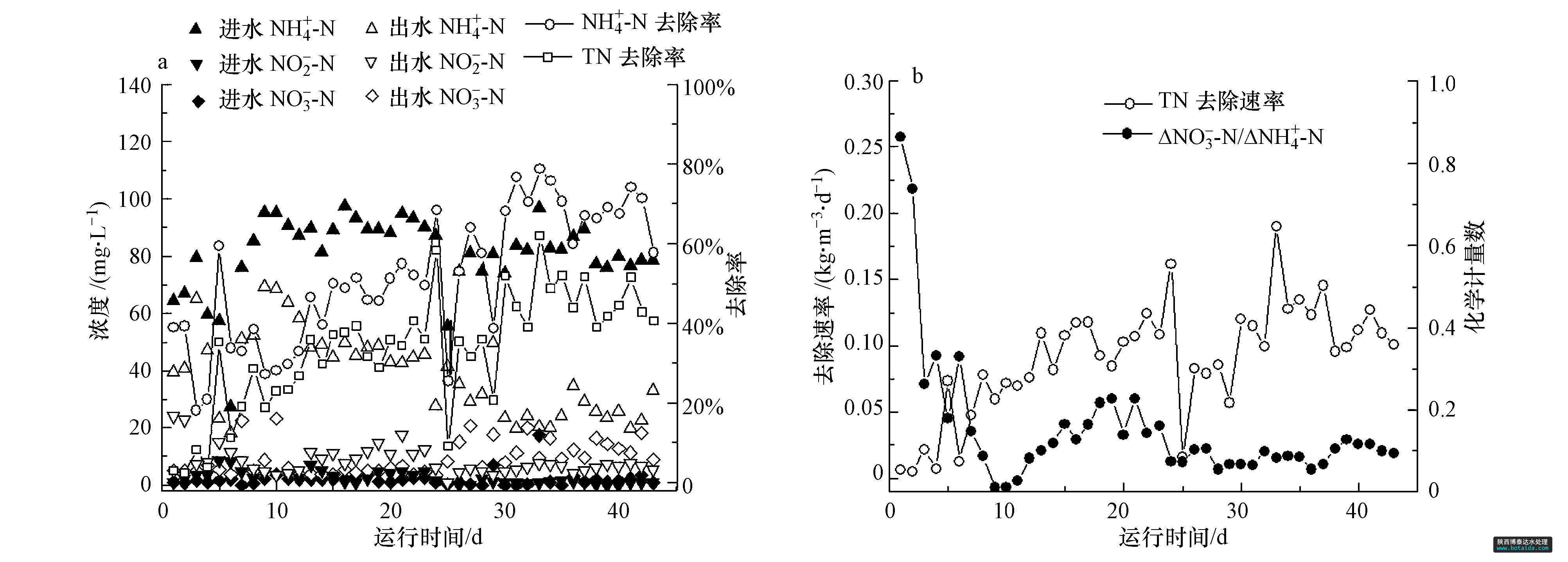 分析認為由于反應器系統(tǒng)由厭氧環(huán)境轉為好氧環(huán)境,厭氧氨氧化菌活性受到DO抑制(Strous et al., 1997).而且啟動階段,由于系統(tǒng)內的AOB在與NOB競爭中處于劣勢,導致出水NO3--N濃度的增加.反應器運行26 d后,NO2--N出現(xiàn)積累,濃度逐漸由3.7 mg · L-1升至20.0 mg · L-1,說明系統(tǒng)內的AOB在與NOB的競爭中逐漸占優(yōu)勢.隨著DO的穩(wěn)定控制,NH4+-N去除效果逐漸提高,去除率在70.0%左右,NO2--N無明顯積累,ΔNO3--N/ΔNH4+-N穩(wěn)定在0.11左右(圖 3b),與 CANON工藝的理論值相近.表明AOB與ANAMMOX建立起了協(xié)同代謝,CANON工藝啟動成功.此時,TN去除率最高至62.0%,TN去除速率最高至0.19 kg · m-3 · d-1(以N計).與任宏洋等(2009)報道的利用EGSB反應器,經(jīng)過50 d的運行成功啟動CANON工藝(TN去除速率0.10 kg · m-3 · d-1(以N計))相比,在啟動方式及脫氮效能方面具有一定的優(yōu)勢.