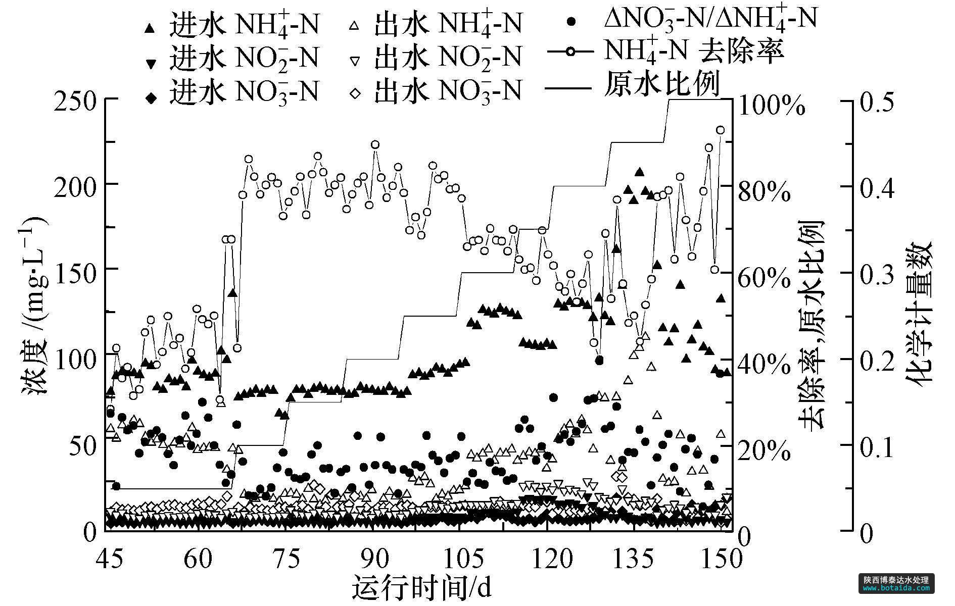 微生物馴化階段,反應器的運行效果如圖 4所示,馴化前期(45~66 d),原水比例為10%,進水NH4+-N濃度較低(約85.0 mg · L-1),去除率在28.8%~67.6%;此階段NO2--N出現(xiàn)積累,逐漸由6.4 mg · L-1升至15.7 mg · L-1.可見在啟動前期,菌群處在調整適應階段,ANAMMOX菌活性受到一定影響.67~105 d,原水比例由20%逐步提升至50%時,NH4+-N去除率為78.5%±7.4%,ΔNO3--N/ΔNH4+-N為(0.07±0.02),符合CANON工藝AOB和ANAMMOX協(xié)同代謝的特征.隨著原水比例的繼續(xù)提高,NO2--N無明顯的積累,NH4+-N的去除率穩(wěn)定在50.0%以上,ΔNO3--N/ΔNH4+-N在理論值0.11附近波動,說明微生物逐漸適應環(huán)境.整個馴化過程表明,微生物的活性已經(jīng)有了較大提高,新的種群結構已經(jīng)形成.