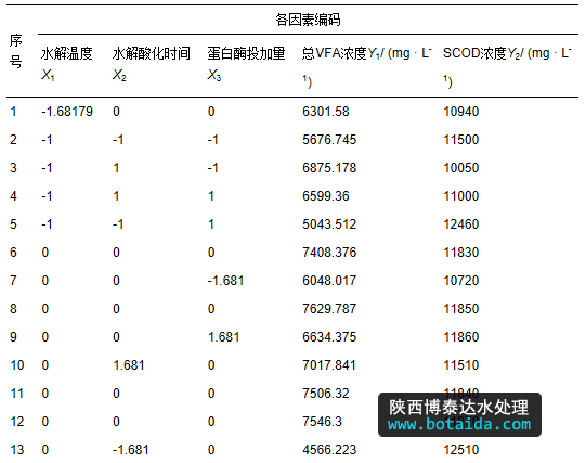 根據(jù)CCD(Central Composite Designs)中心組合試驗(yàn)設(shè)計(jì)原理,在前期單因素試驗(yàn)的基礎(chǔ)上,選擇水解溫度、水解酸化時(shí)間和蛋白酶投加量作為自變量,分別用X1、X2、X3表示,以總VFA濃度和SCOD濃度作為響應(yīng)值,分別用Y1、Y2表示,進(jìn)行響應(yīng)面試驗(yàn)因素水平安排,具體見表 1.由Design Expert 8.0.6(Stat-Ease),采用CCD試驗(yàn)設(shè)計(jì)原理,得到3因素3水平共20個(gè)試驗(yàn)點(diǎn)的試驗(yàn)方案,并對試驗(yàn)數(shù)據(jù)進(jìn)行二次多元回歸擬合.二次多元回歸方程為:
