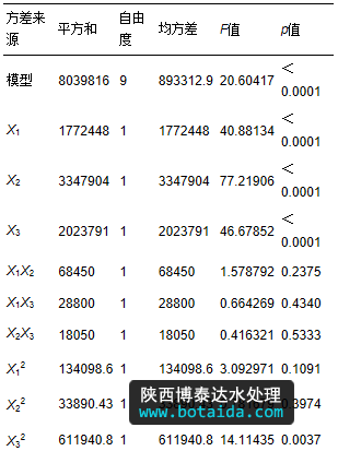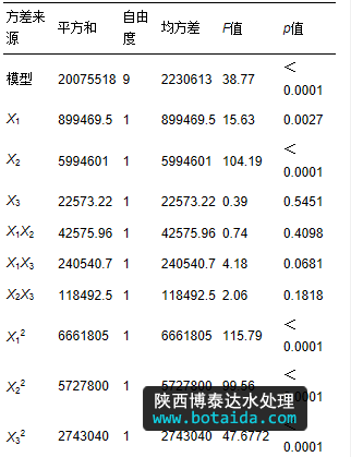 式中,Y為響應(yīng)值;X1、X2、X3為自變量編碼值;B0為常數(shù)項(xiàng);B1、B2、B3為線性系數(shù);B12、B13、B23為交叉項(xiàng)系數(shù);B11、B22、B33為二次項(xiàng)系數(shù);e為誤差. 對模型進(jìn)行方差分析,并通過模型得到基于微波-過氧化氫-堿預(yù)處理的污泥水解酸化的優(yōu)化工藝條件和最大總VFA濃度.