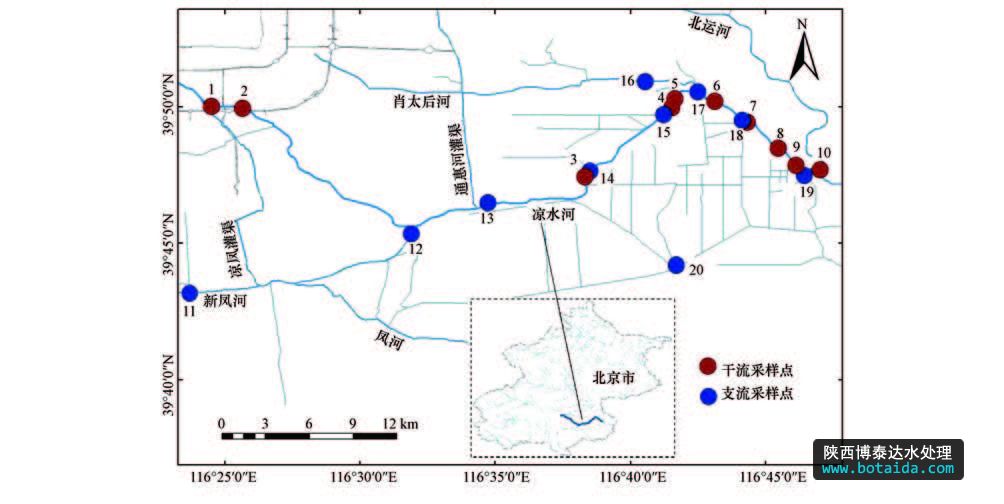 基于涼水河水系空間分布情況和污染源位置,選取涼水河干流上游、下游及主要支流為研究區(qū)域,共設(shè)置20個(gè)采樣點(diǎn)(干流10個(gè)、支流10個(gè))(圖 1).具體分布如下:1~3號(hào)采樣點(diǎn)位于干流上游,4~10號(hào)采樣點(diǎn)位于干流下游,11~20號(hào)采樣點(diǎn)位于支流.樣品于2014年7月進(jìn)行采集,用抓斗式采樣器平行3次采集河流表層0~10 cm的沉積物樣品,裝入自封袋并置于車載冰箱中在4 ℃下保存.帶回實(shí)驗(yàn)室后,將樣品充分混勻、冷凍干燥、過(guò)100目尼龍篩,然后置于自封袋中密封保存待測(cè).