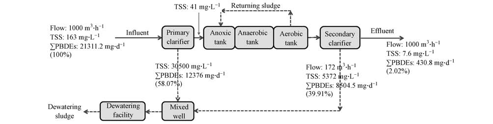 式中,M是各構(gòu)筑物污水或污泥的PBDEs日均負荷量(mg · d-1);C是各構(gòu)筑物污水或污泥中PBDEs的濃度(ng · L-1,ng · g-1);V是污水的日均流量(m3 · d-1);TSS是污水中總懸浮顆粒物濃度(mg · L-1).