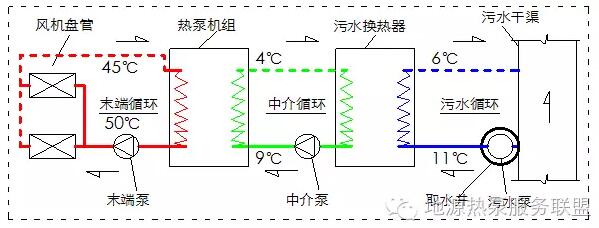 3)最后,45℃左右的末端系統(tǒng)水經(jīng)末端泵輸送,同樣在配置合理有效狀態(tài)下進(jìn)入熱泵機(jī)組進(jìn)行換熱,將熱泵機(jī)組從低溫那里轉(zhuǎn)化來(lái)的高溫?zé)崃课?,再?/span>50℃左右進(jìn)入末端散熱設(shè)備將熱量釋放給建筑空間,實(shí)現(xiàn)末端循環(huán)。