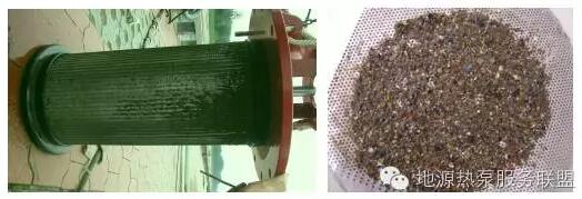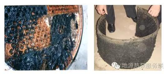 1)防堵塞。未處理原生污水中含有大尺度懸浮物,包括纖維狀的發(fā)絲類、紙屑類、藻狀類,普通的換熱設(shè)備是根本無(wú)法承受的。而實(shí)踐證明:已處理污水和地表水中的懸浮物含量相對(duì)較少,盡管與未處理原水不在同一數(shù)量級(jí),但隨著運(yùn)行時(shí)間增長(zhǎng),堵塞問(wèn)題也立即突現(xiàn),原水的堵塞時(shí)間為1~3d,而地表水則為7~10d。圖4是未處理原生污水的堵塞現(xiàn)象,圖5是已處理污水的堵塞狀況。