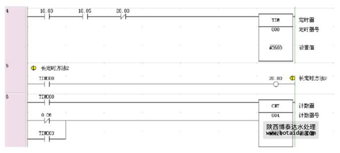 上圖是專門為自動控制形式下的計時裝置,為長定時的一種,因?yàn)門IM最多記錄可以999.9S而一般工作周期為1天所以加上CNT兩者相互配合起到長定時的作用。將這段程序設(shè)置常開1003,常開1006,常閉2000,在這一段程序后面必須要設(shè)置了一個定時器,TIM000,因?yàn)橐獙⒑芏嗟奈鬯M(jìn)入到這個污水處理系統(tǒng)中來,進(jìn)入到提前設(shè)置好的罐子里,所以時間要設(shè)置的要長一點(diǎn),設(shè)置為一小時已經(jīng)很充足了,這樣污水就能源源不斷的進(jìn)入到罐子里,這樣就能實(shí)現(xiàn)我事先設(shè)置的要盡可能多的將來污水進(jìn)行處理,這樣對應(yīng)用實(shí)際是很必要的,但是要是在實(shí)驗(yàn)的時候就要設(shè)置的時間短一點(diǎn),那樣就不用等待那么長的時間了,實(shí)驗(yàn)的結(jié)果就很容易很輕易的一目了然了,不必等待那么長的時間去看到這個污水處理系統(tǒng)所要達(dá)到的結(jié)果,這一段時間實(shí)現(xiàn)后,下面要實(shí)現(xiàn)的就是長定時的方法2,設(shè)置常開點(diǎn)TIM000,在常開點(diǎn)TIM000后接上線圈2000,這一小段程序雖然在整個污水處理系統(tǒng)中起到的作用不是十分的重要,但是整套系統(tǒng)如果出現(xiàn)了什么問題,那么就必須得需要第二套程序,來讓系統(tǒng)再次正常的繼續(xù)進(jìn)行污水處理的過程.它的作用就是將這個過程設(shè)置好時間來進(jìn)行下一步驟,這也是手動方式所必須要存在的程序,常開TIM000,這個常開TIM000就是上段的定時器,就是說上面的定時器,一旦實(shí)現(xiàn)好它的功能,那么這一段程序就開始運(yùn)行了,在常開點(diǎn)TIM000后面接上線圈2000,下一段程序就要設(shè)置好定時器,實(shí)現(xiàn)定時的功能,常開點(diǎn)TIM000,常閉0006,常開TIM003,它們后面都要接定時器CNT004,設(shè)置的時間為0024,也就是24秒,至于這個時間定時的多少都是沒有太大的關(guān)系和影響,主要的目的就是要將系統(tǒng)更多,更好,更高效的進(jìn)行污水處理,這一當(dāng)關(guān)機(jī)時或者進(jìn)入下一個工作周期CNT需要復(fù)位,所以在CNT復(fù)位端并聯(lián)上0006,TIM003,起到復(fù)位作用。