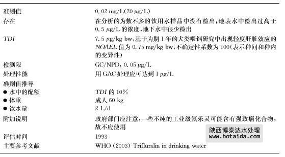 氟樂靈(CASNo.1582 09 8)是一種用于多種農(nóng)作物的芽前除草劑。它水溶性低,與 土壤有很高的親和力。然而,生物降解和光降解過程可能生成能污染飲用水源的極性代謝 物。盡管氟樂靈在許多國家都有使用,但關(guān)于飲用水污染的數(shù)據(jù)相當(dāng)有限。