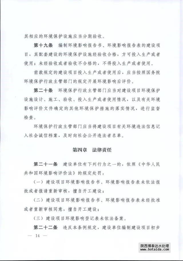 第六條 國家實行建設(shè)項目環(huán)境影響評價制度。 建設(shè)項目的環(huán)境影響評價工作,由取得相應(yīng)資格證書的單位承擔(dān)。