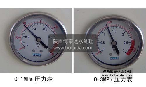 4 、壓力表:測量系統(tǒng)進(jìn)水壓力、段間壓力、濃水壓力、產(chǎn)水壓力。