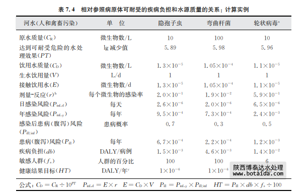 當(dāng)需將一個(gè)病例中發(fā)生特定疾病的風(fēng)險(xiǎn)轉(zhuǎn)化為疾病負(fù)擔(dān)時(shí),可以使用DALY(metric disabilityadjustedlifeyear)(見第3章3.1)。這不但反映了急性終點(diǎn)反應(yīng)(腹瀉),也反映了 死亡率和更嚴(yán)重的終點(diǎn)反應(yīng)(如與彎曲桿菌有關(guān)的格林 巴利綜合癥,即急性感染性多發(fā)神 經(jīng)炎)。每個(gè)病例的疾病負(fù)擔(dān)變化很大。例如,每1000例輪狀病毒的疾病負(fù)擔(dān)在低收入地 區(qū)為480DALYs,而且還經(jīng)常發(fā)生兒童死亡。但在大多數(shù)居民都能得到醫(yī)療救助的高收入 地區(qū)僅為14DALYs/1000例(見附錄1支持性文件《世界衛(wèi)生組織飲用水水質(zhì)準(zhǔn)則中公共 衛(wèi)生風(fēng)險(xiǎn)量化》)。由于這種疾病負(fù)擔(dān)上的明顯差別,為了要達(dá)到相同的危險(xiǎn)程度(以 DALYs/人/年表示),在相同水源質(zhì)量的情況下,在低收入地區(qū)就需要實(shí)施更嚴(yán)格的水處 理。表7.4中10-6DALY/人/年這樣的健康結(jié)果目標(biāo)最好能與具體國情相結(jié)合。表7.4中 沒有免疫缺陷人群的計(jì)算數(shù)值(如 HIV/AIDS患者中的隱孢子蟲病),在某些國家,這些人群的數(shù)量還是很多的。3.2節(jié)中有更多關(guān)于DALY的信息,及關(guān)于如何將其用于獲取風(fēng)險(xiǎn) 參考值。