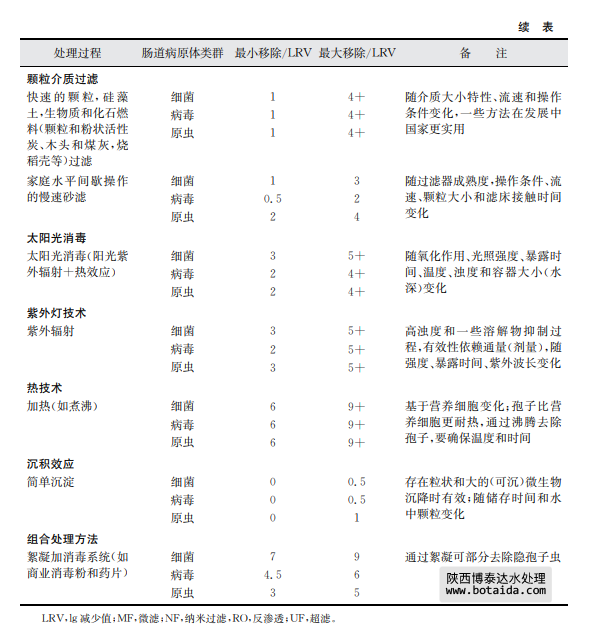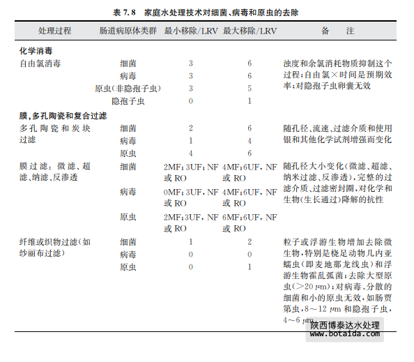 表7.8總結(jié)了采用上述幾種家庭水處理技術(shù)對(duì)水傳播細(xì)菌、病毒和寄生性原生蟲的 去除情況。這些去除信息是基于科學(xué)文獻(xiàn)報(bào)告的研究結(jié)果。有兩個(gè)有效性內(nèi)容:基本去 除和最大去除。基本去除是指由相對(duì)不熟練人員實(shí)際操作時(shí)的一般運(yùn)行效果,且操作人 員將以上方法用于處理平均水質(zhì)或可變水質(zhì)原水及現(xiàn)場(chǎng)只有很少應(yīng)用工具以優(yōu)化處理?xiàng)l 件和操作時(shí)。最大去除是指在熟練操作和優(yōu)化運(yùn)行條件下,并且在可預(yù)見和不變水質(zhì)條 件下,有相關(guān)儀器工具支持并保持最高水平運(yùn)行時(shí)達(dá)到的效果(如測(cè)試一個(gè)已知濃度和種 屬的微生物時(shí))。應(yīng)當(dāng)該注意的是某些水處理工藝的lg減少值存在差異,如表7.8中的 家庭水處理和表7.7中的集中處理。這種相同處理技術(shù)、不同的運(yùn)行效果差異是可以理 解的。因?yàn)榧刑幚硭盟ǔM足處理工藝所需要的質(zhì)量,而且處理過(guò)程由訓(xùn)練有素的操作人員使用,工藝經(jīng)過(guò)合理的設(shè)計(jì)并有良好的運(yùn)行控制系統(tǒng)。相反,家庭水處理通常 水質(zhì)變化較大,也沒有得到最好的運(yùn)行技術(shù)優(yōu)化。相對(duì)于管理集中處理設(shè)施的人員,處理 過(guò)程也常常得不到專業(yè)人員的專業(yè)運(yùn)行控制。這些處理過(guò)程的進(jìn)一步細(xì)節(jié),包括運(yùn)行影 響因子和表7.8中提供的lg減少值水平基礎(chǔ),可見附錄1支持性文件《家庭水管理和家庭 水處理選擇評(píng)估》。陜西博泰達(dá)水處理為您提供服務(wù)。