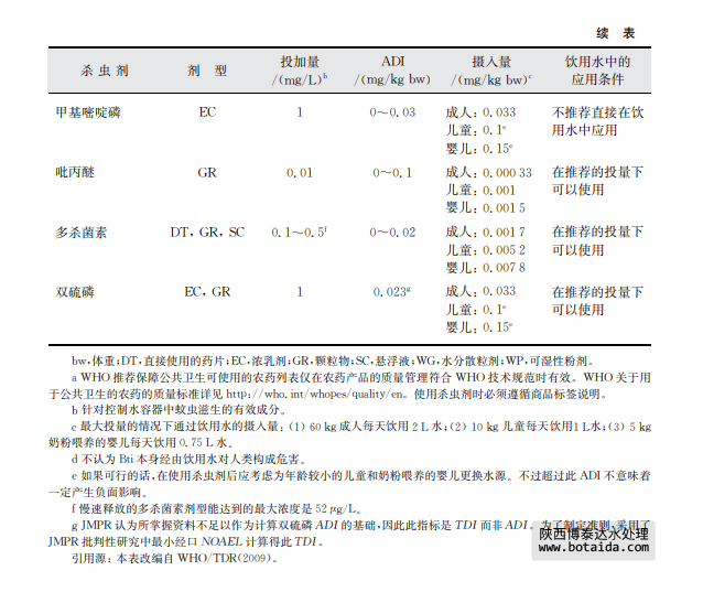雖然沒必要為以控制攜菌體為目的的農(nóng)藥設(shè)定準(zhǔn)則值,但有必要就它們使用時的安全 性提供足夠的信息。用于飲用水?dāng)y菌體控制的農(nóng)藥劑型必須嚴(yán)格遵守商品標(biāo)簽建議,并且 包括從材料到配制最終產(chǎn)品的配方組分,一定要使用國家主管部門批準(zhǔn)可用于此用途的產(chǎn) 品。為制定準(zhǔn)則評估控制攜菌體的農(nóng)藥時,評價報告主要由犃犇犐與潛在暴露風(fēng)險的比較組 成。不過,超過犃犇犐的攝入不一定意味著會對健康產(chǎn)生負(fù)面影響。由于攜菌體傳播的疾病 有很高的發(fā)病率和死亡率,控制病原昆蟲與飲用水?dāng)z入農(nóng)藥量之間必須找到一個合適的平 衡。需要強調(diào)的是,應(yīng)努力使總攝入量和任何殺幼蟲劑的濃度都低于 WHOPES的推薦水 平,并且在具有足夠的效力條件下盡可能低。