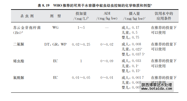 在許多國家,控制以昆蟲為媒介傳播的疾病(如登革熱)非常重要,并且攜菌體(尤其是 蚊子)有機會在飲用水的貯藏和采集容器中產(chǎn)卵。盡管必須有防止這些攜菌體進入或在這 類容器中產(chǎn)卵的措施,但這種方式不可能完全有效或不能一直有效,在某些情況下就需要使 用蚊蟲幼蟲殺滅劑。
