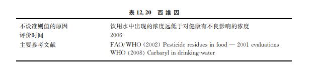 西維因(CASNo.63 25 2)是一種用于控制農(nóng)作物、樹(shù)木和觀賞植物害蟲(chóng)的廣譜氨基 甲酸酯類(lèi)殺蟲(chóng)劑,它在公共衛(wèi)生和獸醫(yī)實(shí)踐中也有一些用途(見(jiàn)表12.20)。尚未有報(bào)道證明 飲用水中含有西維因,但它可能會(huì)經(jīng)滲流和噴灑進(jìn)入地表水。因此,除非在特殊情況下,通 過(guò)飲用水的接觸量是非常低的。普通人群中,攝入西維因的主要途徑是食物,但殘余量認(rèn)為 相對(duì)較低.