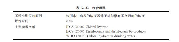 水合氯醛或者三氯乙醛是當水中含有有機前體物(如富里酸和腐殖酸)時,生成的氯 化消毒副產(chǎn)物(見表12.23)。有研究發(fā)現(xiàn)它在飲用水中的濃度可高達100μg/L,但是通 常濃度低于10μg/L。一般地表水中的濃度高于地下水,其濃度在水的輸送過程中可能會 增高。
