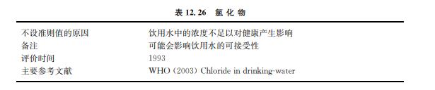 飲用水中的氯化物(見表12.26)主要有天然來源、污水排放和工業(yè)污染物、含有防凍鹽 的城市地表徑流和咸水侵蝕。 人對氯化物的主要暴露來自添加至食物中的鹽,并且從食物中攝入的氯化物遠(yuǎn)比從飲 水中取得多。
