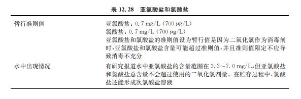 亞氯酸鹽和氯酸鹽是使用二氧化氯作為消毒劑或用于去除水中嗅味和異味的副產(chǎn)物 (見表12.28)。二氧化氯同時也用作纖維、紙漿、面粉和油類的漂白劑。亞氯酸鈉和氯酸鈉 用于制備二氧化氯以及其他商業(yè)用途。飲用水出水中,二氧化氯迅速分解成亞氯酸鹽、氯酸 鹽和氯化物離子,其中亞氯酸鹽是主要成分,該反應(yīng)在堿性條件下容易進(jìn)行。飲用水是接觸 環(huán)境中二氧化氯、亞氯酸鈉和氯酸鈉的主要途徑。氯酸鹽也會在儲存很久的次氯酸鈉溶液 中生成,特別是在高溫環(huán)境下。