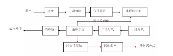 水處理系統(tǒng)由調(diào)節(jié)池、缺氧池、好氧池(接觸氧化池)、二沉池組成。來自生產(chǎn)車間的污水自流入調(diào)節(jié)池,調(diào)節(jié)池入口設(shè)機(jī)械格柵,以攔截大顆粒狀和纖維狀雜質(zhì),在調(diào)節(jié)池中污水充分地混合,調(diào)節(jié)水量并初步降解有機(jī)物,然后通過污水泵將污水輸入氣浮池,去除油污,懸浮物進(jìn)入缺氧池,在缺氧池中回流混合液與原污水充分混合,通過兼氧微生物的作用,將亞硝酸氮和硝酸氮轉(zhuǎn)化為氮氣,完成反硝化脫氮,缺氧池出水自流入接觸氧化池。接觸氧化池是一種以生物膜法為主,兼有活性污泥法的生物處理裝置,通過鼓風(fēng)機(jī)提供氧源,使污水中的有機(jī)物與池內(nèi)生物膜充分接觸,經(jīng)微生物吸附、降解作用,使水質(zhì)得到凈化。二沉池出水進(jìn)入混凝沉淀,進(jìn)一步去除污染物,使出水達(dá)標(biāo)排放。