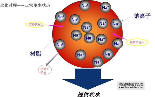 當(dāng)水中的鈣鎂離子含量高時,離子交換樹脂可以釋放出鈉離子,功能基團(tuán)與鈣鎂離子結(jié)合,這樣水中的鈣鎂離子含量降低,水的硬度下降。硬水就變?yōu)檐浰@是軟化水設(shè)備的工作過程。