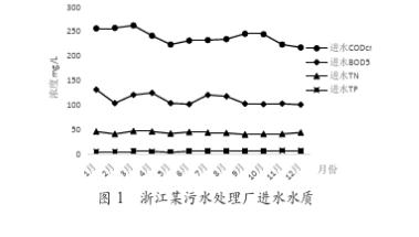 圖1是浙江某污水處理廠(chǎng)的2017年進(jìn)水水質(zhì)。通過(guò)分析,全年進(jìn)水COD平均值為240 mg/L,進(jìn)水BOD為111 mg/L,進(jìn)水總氮為43 mg/L,總磷為5.78 mg/L。來(lái)水中BOD/COD=0.46/0.45,通過(guò)可生化性分析,該進(jìn)水屬于易生化廢水。碳氮比分析中,BOD/TN=2.58;而在日常分析中,碳氮比低至2.0~2.1;相關(guān)研究表明,碳氮比在4~5時(shí),才能有較好的脫氮除磷效果。通過(guò)以上分析,本廠(chǎng)的進(jìn)水雖然易生化,但是碳氮比較低,特別是在進(jìn)水碳源較低的情況下,低碳源對(duì)于出水穩(wěn)定達(dá)標(biāo)造成一定的風(fēng)險(xiǎn),因此需要外加碳源作為進(jìn)水碳源的補(bǔ)充。