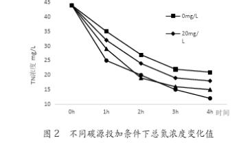 如圖2表示,葡萄糖作為外加碳源,在投加量分別為0、20mg/L、40mg/L和80mg/L情況下,總氮隨時(shí)間的變化值??偟S反應(yīng)時(shí)間的延長(zhǎng),濃度逐漸降低,最終出水濃度分別為21mg/L、18mg/L、15mg/L和12mg/L。在投加碳源后,系統(tǒng)對(duì)脫氮的效果有所提升,對(duì)總氮的去除率分別為52%、59%、66%和73%。投加碳源達(dá)到20mg/L后出水滿(mǎn)足《城鎮(zhèn)污水處理廠(chǎng)污染物排放標(biāo)準(zhǔn)》GB18918-2002中的一級(jí)B標(biāo)準(zhǔn),而且隨著投加量的增加,系統(tǒng)對(duì)總氮的處理效果增強(qiáng)。實(shí)驗(yàn)表明:碳源的投加,保證了硝化細(xì)菌,特別是異養(yǎng)型反硝化細(xì)菌對(duì)碳源的需求,提高的脫氮的效果。