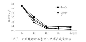 如圖3表示,葡萄糖作為外加碳源,在投加量分別為0、20mg/L、40mg/L和80mg/L情況下,總磷隨時(shí)間的變化值??偭纂S反應(yīng)時(shí)間的延長(zhǎng),濃度逐漸降低,最終出水濃度分別為1.2mg/L、1.0mg/L、0.6mg/L和0.5mg/L。在投加碳源后,系統(tǒng)對(duì)除磷的效果有所提升,對(duì)總磷的去除率分別為80%、83%、90%和92%。投加碳源達(dá)到20mg/L后,出水均滿(mǎn)足一級(jí)B標(biāo)準(zhǔn),而且隨著投加量的增加,系統(tǒng)對(duì)總磷的處理效果增強(qiáng)。