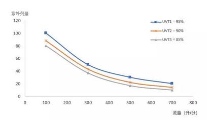 生物驗(yàn)證是通過向紫外線消毒系統(tǒng)加入目標(biāo)微生物,測定目標(biāo)微生物的滅活率,反推紫外設(shè)備的劑量及消毒性能的。首先,用紫外平行光儀均勻照射已知濃度的目標(biāo)微生物樣品,檢測照射后微生物濃度以確定滅活率。根據(jù)紫外強(qiáng)度、暴光時(shí)間等試驗(yàn)因素,計(jì)算微生物的紫外線照射劑量,最終得到目標(biāo)微生物的紫外線劑量-滅活率曲線。然后,進(jìn)行紫外線反應(yīng)器的測試,將驗(yàn)證微生物加入到紫外線消毒系統(tǒng)的上游,在確定流量、UVT、UV功率等條件下,測定目標(biāo)微生物的滅活率。根據(jù)檢測結(jié)果以及上述紫外線劑量-滅活率曲線,可得在不同紫外燈輸出功率和不同紫外線穿透率條件下,紫外線水消毒設(shè)備處理流量-劑量關(guān)系曲線,如圖1所示。圖1中UVT為水體紫外穿透率,橫坐標(biāo)為設(shè)備所處理的流量,縱坐標(biāo)為設(shè)備的實(shí)際劑量。