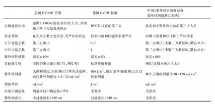 美國環(huán)境保護(hù)局于2006年頒布了UVDGM手冊(cè)。在手冊(cè)中對(duì)紫外線消毒設(shè)備的規(guī)劃、設(shè)計(jì)、驗(yàn)證和運(yùn)行做了規(guī)范說明,概述了運(yùn)用現(xiàn)有的紫外設(shè)備,應(yīng)如何處理指定微生物以使其喪失活性,并提出了針對(duì)指定微生物的紫外線輻射劑量要求,是世界上應(yīng)用最廣、最權(quán)威的規(guī)范之一。與其他驗(yàn)證方法相比,UVDGM可根據(jù)前處理情況及測試結(jié)果靈活選擇紫外線劑量。