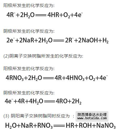 在利用滲析的極化過程中,由于在水溶液中會(huì)產(chǎn)生H+和OH-,使樹脂在化學(xué)反應(yīng)中進(jìn)行電化學(xué)再生,這對水質(zhì)的提升具有正面的影響,而在再生的過程中,如果不進(jìn)行離子交換處理,就會(huì)造成水質(zhì)變壞,這樣就需要采用適宜的工作環(huán)境,才能達(dá)到提高水質(zhì)的要求,采用EDI裝置的離子交換樹脂技術(shù),可以有效的提高水質(zhì)。具體的化學(xué)反應(yīng)方程式如下,