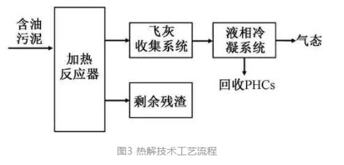 在無氧條件下,含油污泥經(jīng)高溫?zé)峤廪D(zhuǎn)化為氣、液、固三相,氣相產(chǎn)品以CH4、CO2、H2和CO為主,液相一般為常溫燃油和水,固相殘渣中含有焦炭,一般以回收液態(tài)PHCs為主,可不調(diào)質(zhì)達(dá)到回收目的。熱解反應(yīng)在還原氣氛下進(jìn)行,產(chǎn)二噁英極少,其典型工藝流程如圖3所示。