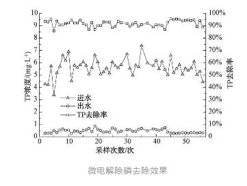 微電解除磷去除效果如下圖所示, 進水 TP 濃度為3.5~7 mg/L,平均濃度為5.64 mg/L。當進水TP濃度為3.5~5 mg/L時,出水TP濃度穩(wěn)定于0.5 mg/L以下,達到一級A標準;當進水TP濃度在5~7 mg/L時,出水TP濃度穩(wěn)定小于1 mg/L,達一級B標準;平均去除率為91.84%~95%。項目試驗結果表明,微電解除磷-砂濾技術可有穩(wěn)定高效的除磷效果,出水TP穩(wěn)定達標。