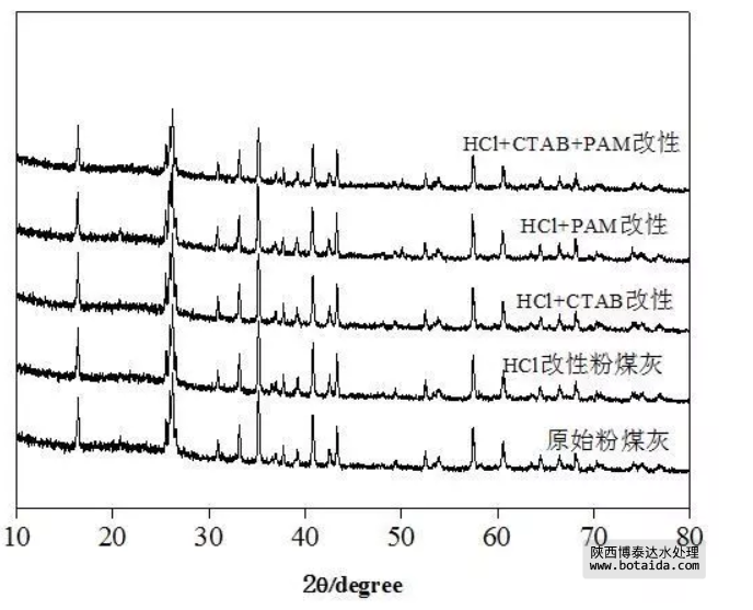 上圖為原始粉煤灰及改性粉煤灰的XRD譜圖。由圖可知,原始粉煤灰的X射線衍射譜圖與經(jīng)過(guò)改性的粉煤灰的X射線衍射譜圖相比,特征峰位置基本不變,這與粉煤灰是在高溫下形成的有很大關(guān)系,其在高溫下形成玻璃體結(jié)構(gòu)和組成成分很難改變。SiO2的特征衍射峰在26°附近,Al2O3的特征衍射峰在43°附近,Ca(OH)2的特征衍射峰在32°附近,峰面積與其含量有關(guān),含量越高,峰面積越大。由圖可知,SiO2的特征峰基本不變,說(shuō)明粉煤灰的基本玻璃體結(jié)構(gòu)大部分未被破壞。Al2O3和Ca(OH)2的特征衍射峰值略微減少,說(shuō)明HCl改性使其溶出,增大了粉煤灰的表面粗糙度,增加了吸附位點(diǎn),這與SEM圖表征結(jié)果一致。粉煤灰中玻璃體的含量可以由XRD圖譜上有許多分散的細(xì)小峰包的峰面積和峰范圍大小相對(duì)表示,由圖可得,粉煤灰的衍射強(qiáng)度降低,改性粉煤灰的峰包面積小于原始粉煤灰,說(shuō)明改性過(guò)后的玻璃體結(jié)構(gòu)部分被破壞。